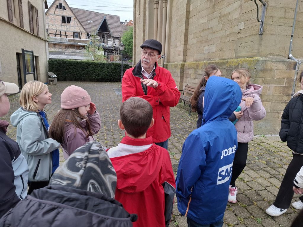Am Montag, den 13.04.26, machten wir, die Klasse 4a, zusammen mit der Klasse 4b und unseren Klassenlehrerinnen Frau Tiefenbach und Frau Reinfant eine Dorfführung in unserem Dorf Hoffenheim. Wir trafen uns vor dem Heimatmuseum mit Herrn Gattung, Herrn Hartmann und Herrn Riehl und einigen anderen Herren. Herr Riehl kennt sich sehr gut mit historischen Gebäuden aus. Die Klasse 4b ging mit Herrn Hartmann mit und die 4a mit Herrn Riehl. Nachdem er sich bei uns vorgestellt hatte, liefen wir zum ersten Gebäude. In diesem alten Fachwerkhaus ist heute eine Wirtschaft. Wir schauten uns dort ein Wappen an, wo ein Kranich auf einem Anker steht. Am Nachbargebäude sieht man eine Skala. Daran kann man erkennen, wie hoch das Wasser bei einer Hochwasser-Überschwemmung gestanden hat. Weiter ging es zur Gemeindehalle. Dort stand früher ein kleines Schloss. Danach gingen wir weiter in Richtung Dönerladen. Hier wurde uns erzählt, dass Dietmar Hopp früher dort gewohnt hat. Er spielte als Junge in Hoffenheim Fußball. In dem grünen Gebäude daneben war früher eine Metallschmiede. Danach liefen wir weiter zum Bahnhof. Da wo heute die katholische Kirche steht, stand früher eine Kapelle. Von dort liefen wir weiter zum Rathaus. Weiter ging es durch eine kleine Gasse am ehemaligen Restaurant „Zum Adler“ vorbei zur evangelischen Kirche. Wir sahen noch den Pfarrbrunnen und ein altes Haus, das etwa 300 Jahre alt ist. Zurück beim Heimatmuseum bedankten wir uns ganz herzlich für die tolle Dorfführung und bekamen zum Abschied jeder einen Schaumkuss geschenkt. Das war ein ganz besonders interessanter Schultag!